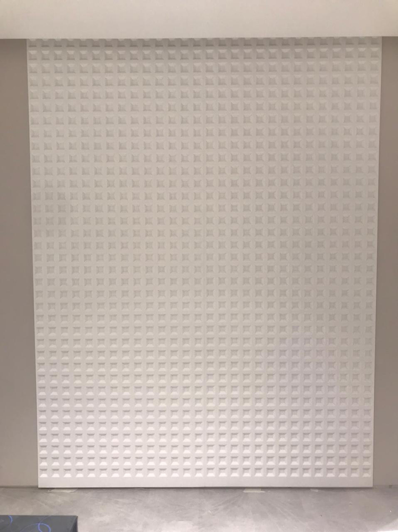 Supply and installation of acoustic polyester felt panels in white color. The 12mm felt backing is glued to the existing wall, and the 2mm felt is cut out to form the pattern.