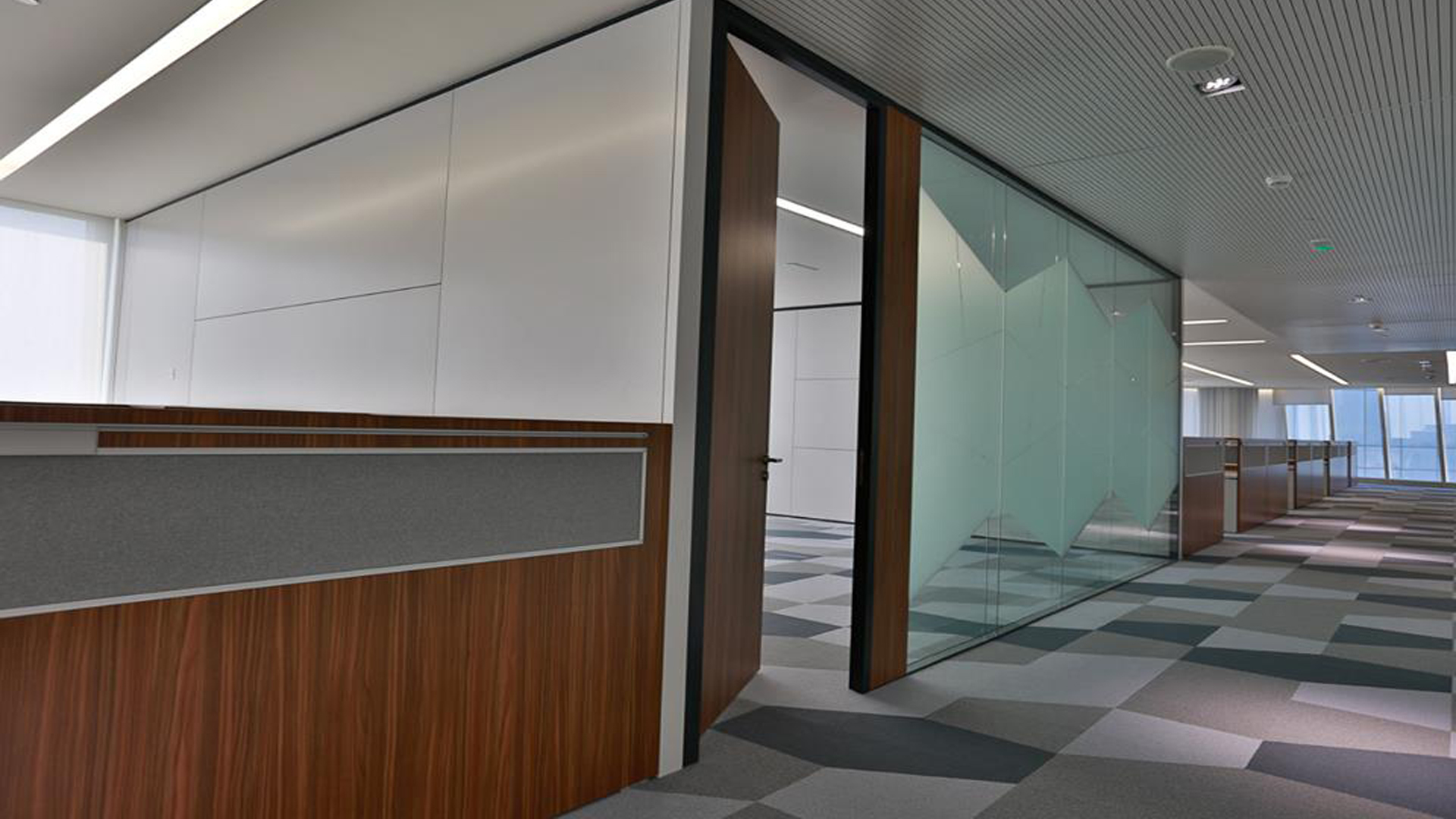 After two successful projects at ADCO, Smart Dimension was fortunate to work on the third project with ADCO which was on a larger scale than before. The project solution was for the supply and installation of demountable partition and acoustic wall panels for its office at Shining Tower. Our premier partner for demountable partition CLESTRA from France and FANTONI from Italy for acoustic wall panels teamed up to provide the solution to the client. The M1 system from CLESTRA was selected by our engineers as it was offering the smallest bottom truck available in the demountable partitions industry with its 18 mm height and being installed directly on the concrete with a carpet thickness, covering almost the whole aluminum profile bottom truck. We reached the result of getting almost a seamless glazed partitions the technical panels had offered to the MVP team the possibility to install all their switcher, AC controller beside of each office wooden door. Also with regard to the acoustic solution Smart Dimensions had proposed its patt acoustic panels for the whole areas of the building corridors.